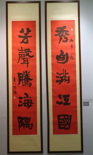 薛铸先生和他的夫人贾维玲女士共同展示向中华慈善总会捐赠书法作品,中华