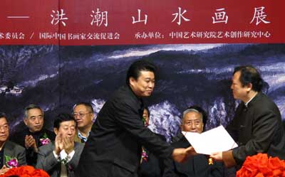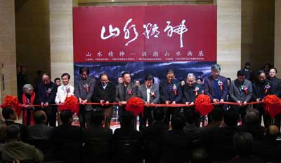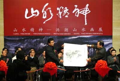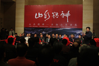 为庆祝中华人民共和国成立61周年,弘扬中华民族优秀传统文化,展示洪潮先生从艺30年的美术创作成就,由文化部中国艺术研究院、中国美术家协会艺委会、国际中国书画家交流促进会主办,中国艺术研究院艺术创作研究中心承办的"山水精神——洪潮山水画展"开幕式,于2010年10月30日,在中国美术馆中央大厅隆重举行。全国政协副秘书长卢昌华,中国文联副主席、中国美协主席刘大为,国家民委副主任、国际中国书画家交流促进会副会长李晋有,中央统战部原副部长田鹤年,中国文联副主席罗扬、仲呈祥,中国人民外交学会副会长程涛,全国人大机关事务管理局局长朱连璋,中宣部局长钟声, 中国书协分党组书记、秘书长、驻会副主席赵长青,李可染艺术基金会理事长邹佩珠,文化部艺术司副司长诸迪,全国人大新闻局副局长王效云,中央保密局副局长郭杰,中国美术馆副馆长马书林,中国艺术研究院副书记、副院长杨化玉,中国艺术研究院副院长、研究生院院长田黎明,中国国家画院副院长解永全,中国国家博物馆馆长助理陈履生,中国美术家协会副秘书长张旭光,中国人民解放军装备指挥技术学院原副院长贺茂之将军,中华慈善总会筹募部主任苏辉,国际中国书画家交流促进会副会长李正钢等有关单位领导,老将军、老部长及社会各界知名人士,中央电视台、北京电视台等首都新闻媒体近五百余人出席开幕式。在开幕式上李晋有主任和田黎明院长分别讲话。开幕式由国际中国书画家交流促进会秘书长张金卫主持。洪潮先生在开幕式上向中华慈善总会捐赠10幅作品,用于中华慈善总会明天会更好慈善爱心艺术交流基金,中华慈善总会筹募部主任苏辉代表中华慈善总会和范宝俊会长接受捐赠并向洪潮先生颁发了捐赠荣誉证书。活动当天,我国美术界的专家、学者薛永年、李松、夏硕琦、徐沛君、王志纯、张敢、赵力忠、陈履生、朱虹子、邹立颖、高玉涛一百余人出席在中国美术馆七楼学术厅召开的"山水精神——洪潮山水画"学术研讨会,在中国艺术研究院王镛先生的主持下研讨会上众多专家学者就有关洪潮先生的艺术道路、艺术成就、艺术思想和艺术理论体系进行了深入的研究讨论。此外,由北京工艺美术出版社出版并全国发行的大型画集《洪潮画集》在开幕式上首发。刘大为、李晋有、田鹤年、罗扬、程涛、钟声、赵长青、诸迪、邹佩珠等为展览剪彩。在展览期间,中共中央政治局委员、全国政协副主席王刚,中宣部副部长王世民、文化部副部长、中国艺术研究院院长王文章、中国文联副主席、书记处书记冯远,国务院参事室副主任万宁,中国美术馆馆长、中国美协副主席范迪安还专程在国际中国书画家交流促进会秘书长张金卫和洪潮先生的陪同下参观了展览,他们对展览给予了很高的评价,并鼓励洪潮先生在今后艺术道路上不断更大的进步。