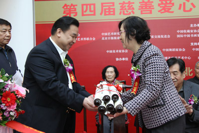中华慈善总会彭玉副会长接受书画家代表向中华慈善总会捐赠作品。