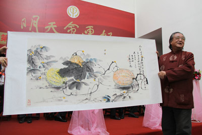 专程从深圳赶来的著名画家崔培鲁先生上台展示向中华慈善总会捐赠的作品。