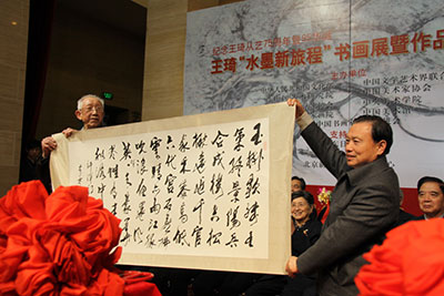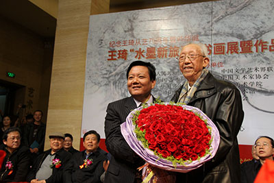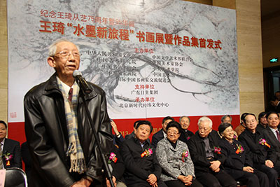 为纪念王琦从艺75周年暨95华诞,展示王琦先生90岁高龄后创作的书画新作,由文化部、中国文联、中国艺术研究院、中国美术家协会、中国书法家协会、中央美术学院、中国美术馆、中国国家画院、国际中国书画家交流促进会共同主办的“王琦水墨新旅程书画展开幕式暨作品集首发式”,于2013年4月3日,在中国美术馆隆重举行。十一届全国人大副委员长周铁农,十届全国人大副委员长何鲁丽、顾秀莲,中国文联原党组书记、政协第十一届全国委员会教科文卫体委员会副主任胡振民,中国文联副主席、书记处书记左中一,原国家新闻出版总署署长、中国出版工作者协会主席于友先,中国人民对外友好协会名誉会长陈昊苏,中国人民解放军国防大学原政委赵可铭上将,国家民委原副主任、国际中国书画家交流促进会副会长李晋有,文化部原副部长常克仁,中国文联副主席、中国美协副主席冯远,中国人民解放军总装备部原副政委崔毅将军,全国政协副秘书长、民革中央副主席李赣骝,中国文联副主席、中国曲艺家协会名誉主席罗扬,中国人民解放军工程兵第一副司令员武宏,中国文联副主席、中国美术家协会主席刘大为,中华慈善总会副会长、空军政治部原副主任邓铜山将军,中国记者协会书记处原书记萧东升,中国书法家协会顾问刘艺,中央电视台原副总编辑、央视国际画院院长赵立凡,中国美术家协会分党组书记、常务副主席吴长江,中国国家画院院长、中国美术家协会副主席杨晓阳,中国美协顾问、中国美术馆原馆长杨力舟,文化部艺术司副司长诸迪,中国美术馆副馆长、中国美术家协会理事马书林,中国美协秘书长刘健,中国收藏家协会常务副会长兼秘书长杨晋英,徐悲鸿纪念馆馆长廖静文,中国美协原书记处常务书记雷正民,中央美术学院原党委书记、中国雕塑学会顾问盛杨,原中央工艺美术学院院长常沙娜,北京画院原副院长吴休,中华慈善总会荣誉副会长、国际中国书画家交流促进会副会长邓培星,世界汉诗协会终身会长、上海大学文学院名誉院长文怀沙,文化部艺术司文美处处长安远远,中国太湖文化论坛执行主席严昭柱,西湖国际艺术家联谊会执行主席顾宏,美国国际美术学会会长李雄风,澳洲岭南画会会长林伯墀,著名书画家及社会各界知名人士薛永年、胡明之、谭涤夫、李树声、莫测、薛铸、刘曦林、廖开明、陶勤、王迎春、杨骥川、骆根兴、王裕国、郭雅君、刘光夏、郝志国、李允经、梁荐铭、周玉兰、王瑞霖、王清杰、朱虹子、贾起家、王云翔等中央和首都新闻界的朋友近千人出席开幕式。国际中国书画家交流促进会秘书长张金卫主持了开幕式。左中一书记、吴长江书记、杨晓阳院长分别讲话,王琦先生致谢辞。在开幕式上,王琦先生向中华慈善总会明天会更好慈善爱心书画艺术交流基金捐赠书法作品一幅,以表达对祖国慈善事业的支持,中华慈善总会副会长邓铜山代表中华慈善总会接受了王琦先生的捐赠,十一届全国人大副委员长、中华慈善总会名誉会长周铁农副委员长向王琦先生颁发了捐赠荣誉证书。周铁农、何鲁丽、顾秀莲、胡振民、于友先、左中一、陈昊苏、赵可铭、李晋有、冯远、诸迪等领导为展览剪彩并参观了展览。在开幕式上,由国际中国书画家出版社编辑出版的精装《纪念王琦从艺75周年暨95华诞——王琦水墨新旅程书画作品集》隆重首发,中国文联副主席、中国美术家协会主席刘大为特为作品集撰写前言。作品集共收录有王琦书画作品105幅,另外还将王琦90岁高龄之后积极参加艺事活动影像收录其中。在开幕式上,张金卫秘书长还宣读了未能出席展览开幕式对展览表示祝贺的领导:九届全国人大副委员长王光英、彭佩云,十一届全国政协副主席阿不来提·阿不都热西提、白立忱、李金华,文化部党组书记、部长蔡武,文化部原副部长、中国艺术研究院院长王文章,中国文联原党组书记高占祥,文化部原副部长、国际中国书画家交流促进会会长潘震宙,中华慈善总会会长李本公,中国人民解放军海军原副政委康成元,中国文联副主席、中国书协主席张海,中国书协顾问欧阳中石,中国书协分党组书记赵长青,李可染艺术基金会理事长邹佩珠等,他们都对展览开幕表示祝贺,并预祝展览取得圆满成功!