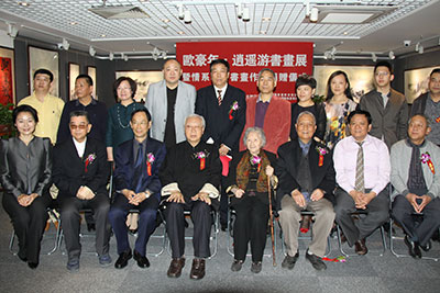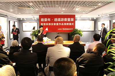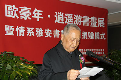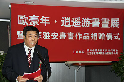 由国际中国书画家交流促进会、北京华夏传承国际拍卖公司主办的“欧豪年书画作品展开幕式暨情系雅安书画捐赠仪式”,于2013年4月27日在京隆重举行。国际中国书画家交流促进会秘书长张金卫主持了开幕式。文化部原副部长、国际中国书画家交流促进会会长潘震宙,国家民委原副主任、国际中国书画家交流促进会副会长李晋有,中国文联原副主席、中国曲艺家协会名誉主席罗扬,中华慈善总会荣誉副会长、国际中国书画家交流促进会副会长、中华慈善总会明天会更好慈善爱心书画艺术交流基金主任邓培星,李可染艺术基金会理事长邹佩珠,中华慈善总会筹募部副主任陈希,北京华夏传承国际拍卖公司董事长张娟,北京华夏传承国际拍卖公司首席艺术顾问、著名鉴定家张正欣,国际中国书画家交流促进会副秘书长陈伟,北京保利国际拍卖有限公司海外部总经理、著名鉴定家李雪松等百余位社会各界知名人士出席。罗扬主席代表主办单位讲话,潘震宙部长宣布“欧豪年书画作品展”开幕。在开幕式上,欧豪年先生心系雅安,在现场创作了一幅四尺整纸山水画由北京华夏传承国际拍卖公司义买,欧豪年先生将此善款共计十万元人民币捐赠给中华慈善总会明天会更好慈善爱心书画艺术交流基金,以表达他对雅安地震灾区人民的关心和对祖国慈善事业的支持。中华慈善总会筹募部副主任、中华慈善总会明天会更好慈善爱心书画艺术交流基金基金管理办公室副主任陈希授受了捐赠,中华慈善总会荣誉副会长、中华慈善总会明天会更好慈善爱心书画艺术交流基金主任邓培星向欧豪年先生颁发了捐赠证书。据悉,由北京华夏传承国际拍卖公司义买下的欧豪年先生创作的这幅山水画作品将参加拍卖,拍卖所得善款还将打入此基金中定向捐赠给雅安地震灾区,专项用于援建国兰慈善小学。