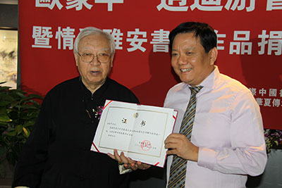 中华慈善总会荣誉副会长、中华慈善总会明天会更好慈善爱心书画艺术交流基金主任邓培星向欧豪年先生颁发捐赠证书(陈伟摄影)