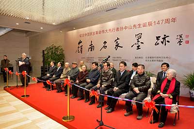为纪念中国民主革命的伟大先行者孙中山先生诞辰147周年,弘扬岭南文化和精神,彰显岭南名家魅力,推动和促进当代岭南文化的发展,由中国艺术研究院、中国政协文史馆、中国文物学会、中国收藏家协会、中国文物保护基金会、中国国际文化艺术中心、国际中国书画家交流促进会共同主办的“岭南名家墨迹展”,于2013年11月5日,在中国政协文史馆隆重开幕。十届全国人大副委员长何鲁丽,全国政协副秘书长刘家强,中国文联原党组书记胡振民,原国家新闻出版总署署长于友先,十届全国人大常委、华侨委员会副主任王宋大,中共中央对外联络部原部长朱良,全国政协民族宗教专委会主任朱维群,原中共中央统战部副部长胡德平,国家民委原副主任李晋有,中国人民解放军海军副政委康成元,中国文联原副主席罗扬,国家文物局副局长张柏,中华慈善总会荣誉副会长邓培星,中国画学会副秘书长林金疆,社会各界知名人士邹佩珠、谢志高、宗家顺、薛铸、骆根兴、贾起家、张杰、杨明义、刘克雄、王裕国、沈一丹等中央和首都新闻界的朋友五百余人出席开幕式。国际中国书画家交流促进会秘书长张金卫主持了开幕式。中国政协文史馆馆长赵珩代表主承办单位讲话。张金卫秘书长宣读了发来贺信贺电名单: 全国人大副委员长许嘉璐、周铁农、顾秀莲,全国政协副主席阿不来提·阿不都热西提、李金华、厉无畏、王文元,原中共中央宣传部副部长、文化部代部长贺敬之,原人民日报社社长邵华泽,全国政协常委、中华慈善总会终身荣誉会长范宝俊,文化部原副部长、国际中国书画家交流促进会会长潘震宙,文化部原副部长、中国艺术研究院院长王文章,中纪委委员、司法部纪检组组长韩亨林,故宫博物院院长、中国文物学会会长单霁翔,中国作协副主席、书记处书记廖奔,中国文联副主席、中国曲艺家协会主席刘兰芳,全国政协常委、中国书协主席张海,全国政协常委、全国政协书画室副主任苏士澍,中国国家画院院长、中国美术家协会副主席杨晓阳,西泠印社社长、国学大师饶宗颐,以及老艺术家、专家学者王琦、廖静文、冯其庸、欧阳中石、邵大箴、薛永年等,他们都对展览表示祝贺并预祝展览取得圆满成功。何鲁丽副委员长宣布“岭南名家墨迹展”开幕,开幕式后,何鲁丽、胡振民、刘家强、王宋大、于友先、朱良、朱维群、胡德平、李晋有、康成元等领导还兴兴致勃勃地观看了展览。