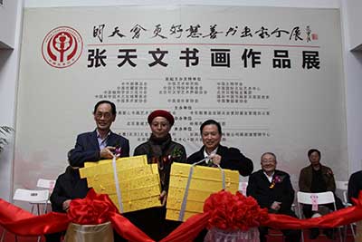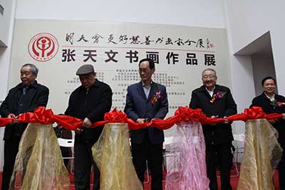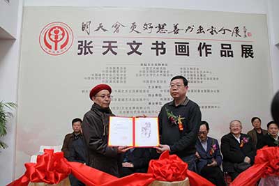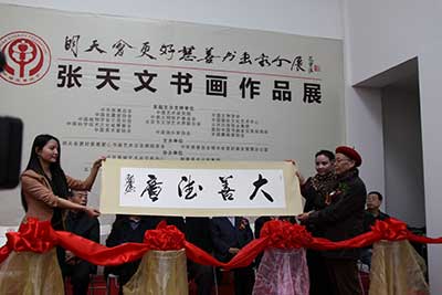 为弘扬中华民族优秀传统文化,支持祖国的慈善事业,展示张天文先生书画艺术成就,促进书画艺术交流,由中华慈善总会、中国艺术研究院、中国美术家协会、中国文物学会、中国收藏家协会、中国文物保护基金会、中国国际文化艺术中心、北京市文联、国际中国书画家交流促进会、东方水墨(北京)文化发展有限公司等众多单位联合举办的“明天会更好慈善书画家个展——张天文书画作品展开幕式暨向中华慈善总会明天会更好慈善爱心书画艺术交流基金捐赠作品仪式”,于2014年3月7日在北京皇城艺术馆隆重举办。中华慈善总会会长范宝俊特为展览题写展名。原国家新闻出版总署署长于友先,原武警总部政委喻林祥,国际中国书画家交流促进会会长、文化部原副部长潘震宙,全国政协副秘书长、民革中央副主席李赣骝,中华慈善总会原副会长邓铜山,国际中国书画家交流促进会副会长李正钢,东方水墨(北京)文化发展有限公司董事长田爱生,老将军、老部长、书画艺术家及社会各界知名人士王立忠、杨景宇、郭旭恒、孙晓青、范承祚、王玉军、赵卫延、李涵、巴湘、王清杰等五百余位出席。国际中国书画家交流促进会秘书长张金卫主持了开幕式。于友先、潘震宙、李赣骝、邓铜山等为展览剪彩并参观了展览。在开幕式上,张天文先生向中华慈善总会明天会更好慈善爱心书画艺术交流基金捐赠作品20幅,以表达他对祖国慈善事业的支持,潘震宙部长、邓铜山会长接受捐赠,中华慈善总会筹募部主任、明天会更好慈善爱心书画艺术交流基金管理办公室执行主任苏辉先生向张天文先生颁发中华慈善总会捐赠荣誉证书。张天文国画《紫气东来》被北京皇城艺术品交易中心收藏。在开幕式上,《国际中国书画家——张天文特刊》也隆重首发。
