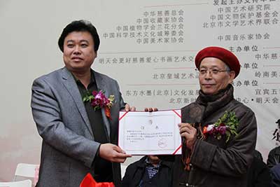 中华慈善总会筹募部主任、明天会更好慈善爱心书画艺术交流基金管理办公室执行主任苏辉先生向张天文先生颁发中华慈善总会捐赠荣誉证书