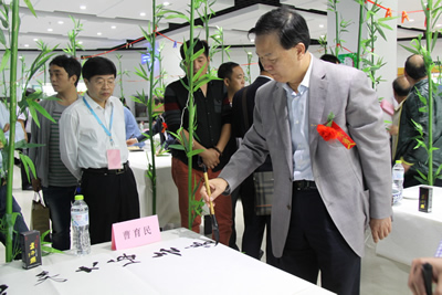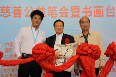 在开幕式上,中国教育电视台副总编辑连保军致欢迎词;中国楹联学会会长蒋有泉,中华慈善总会副会长邓铜山,国际中国书画家交流促进会副会长郭廷真,北京紫禁书院院长陈松龄,书画家代表、北京慈善艺术院院长陈养群,此次活动协办单位、北京卓越艺红文化创意有限公司总经理邹锡红,中国教育网络电视台书画台顾问、中宣部宣教局原副局长司锡龄等分别致辞。他们从不同侧面,对书画台等单位在不到一个月的时间里,策划组织这一大型公益活动,弘扬国粹、服务社会的举措给与了高度评价。爱心书画家代表王信聪、陈养群、张博、宋香菊、张天文、王春云、温凤海、李金泰、于谋勇上台展示了向中华慈善总会明天会更好慈善爱心书画艺术交流基金捐赠的作品。中国教育网络电视台书画台主任张鄂生,北京卓越艺红文化创意有限公司董事长刘卓银代表参加本次活动的书画家捐赠作品,中华慈善总会副会长邓铜山接受捐赠并向爱心书画家代表颁发了捐赠荣誉证书。书画名家李世俊、张坤山、刘俊京、蒋有泉、王云武在开幕式现场分别挥毫书写“明、天、会、更、好”5个六尺斗方大字,莫华生现场创作寓意庆祝建国65周年的巨幅画作《和谐中国 富贵平安图》,现场展示这些作品,将活动推向了高潮。