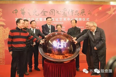 何鲁丽副委员长宣布“第二届中华之光(派顿杯)全国书画作品展”正式启动,并与张文台上将、陈士能会长、李晋有主任、谢安山院长、李赣骝秘书长、何东社长、郭廷真主任共同开启了标志活动启动的水晶球。