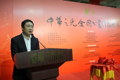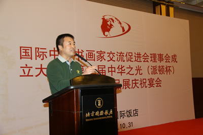 国际中国书画家交流促进会秘书长张金卫正在主持“第二届中华之光(派顿杯)全国书画作品展开幕式”