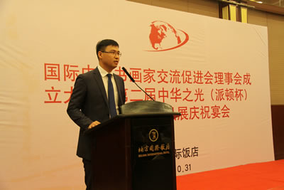 对本次活动给予大力支持的派顿(中国)有限公司董事长、派顿文化艺术中心总顾问、第二届中华之光全国书画作品展组委会执行主任郭廷真先生代表主办单位讲话