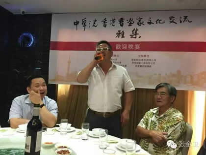 在庆祝宴会上,张金卫秘书长、郭洪球主席、李秋平会长与澳门书画家一起共祝活动圆满成功
