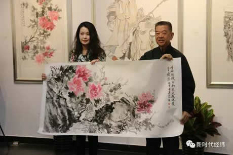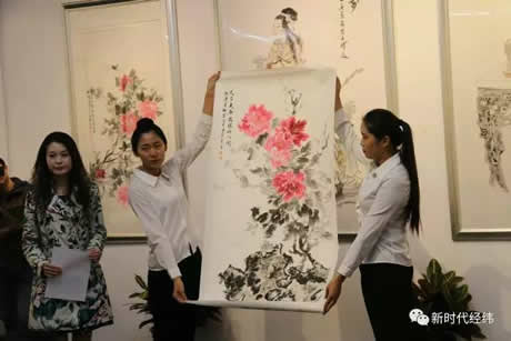 曲真慧女士展示向中华慈善总会明天会更好慈善爱心书画艺术交流基金捐赠的作品,中华慈善总会明天会更好慈善爱心书画艺术交流基金顾问李晋有先生接受捐赠。