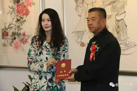 中华慈善总会明天会更好慈善爱心书画艺术交流基金顾问李晋有先生向曲真慧女士颁发捐赠荣誉证书。