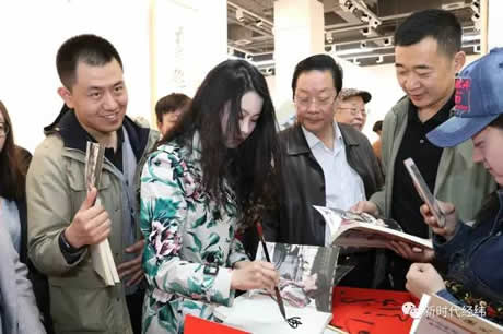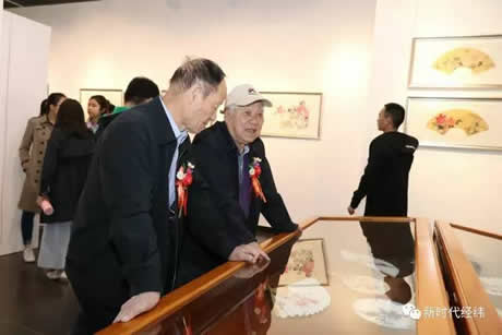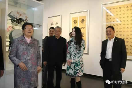十届全国人大常委会顾秀莲副委员长在国际中国书画家交流促进会秘书长张金卫、北京师范大学艺术与传媒学院书法系硕士研究生曲真慧的陪同下参观展览。