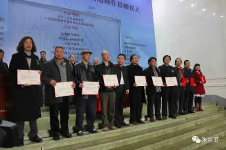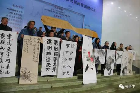 中华之光书画家张若平、周铭、王玉、董红君、万京民、翟鑫、王耀宇、谢莉豪、冯斌、罗三坡展示向中国老龄事业发展基金会公益养老基金捐赠的作品。