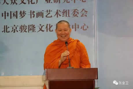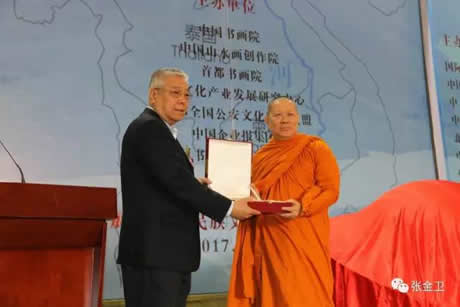 组委会秘书长张金卫代表组委会接受泰国副僧王、岱密中学孔子课堂理事会主席赵昆通猜大师赠送纪念礼品。