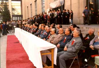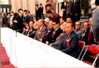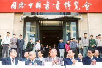 党和国家领导人(右起)李铁映、李岚清、王光英、卢嘉锡、布赫等出席国际中国书画博览会开幕式,并在主席台前排就座。 |