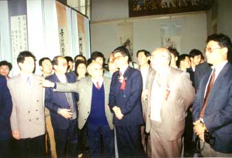 中国文联党组书记高占祥、著名书画家陈大章陪同全国人大副委员长李铁映、王光英在国际中国书画博览会精品书画作品展区观看展览。 |