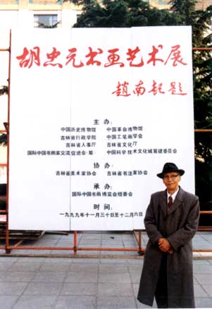 1999年11月30日,由我会与中国工笔画学会、吉林省文化厅、吉林省美协、吉林省书协等单位联合举办的“胡忠元书画艺术展”在中国革命博物馆隆重举行。胡忠元先生在展览宣传牌前留念。 |