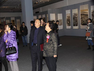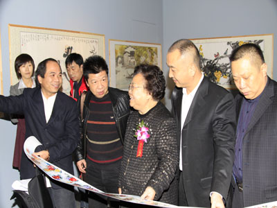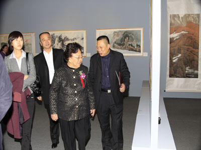 九届全国人大副委员长彭佩云在北京红森尚艺画院院长、本次活动组委会副秘书长王信聪陪同下观看展览