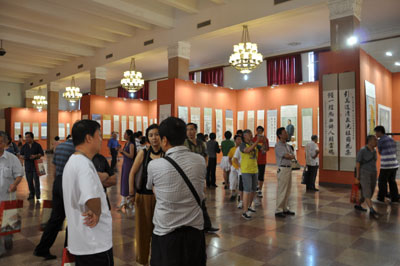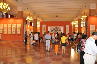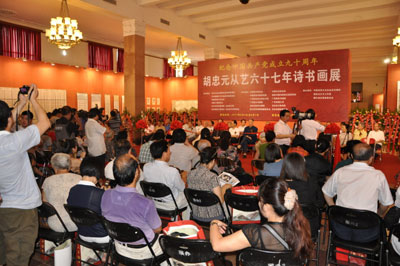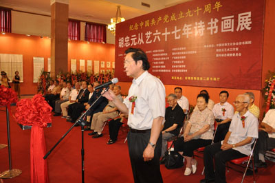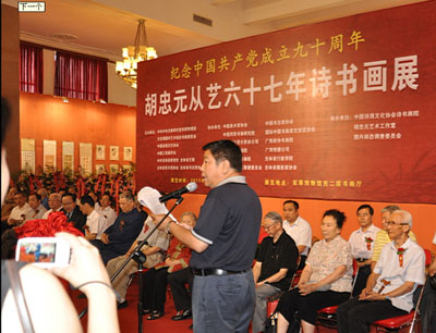 为庆祝中国共产党90华诞,喜迎辛亥革命胜利100周年,值此著名书画家胡忠元同志从艺67周年之际,为展示胡忠元同志在诗书画方面的精品力作,由国际中国书画家交流促进会、中央文献研究室科研管理部、中国工笔画学会、中国美术家协会、中国书法家协会、中国同泽书画研究院、中国诗酒文化协会、中共吉林省委党校、中国诗酒文化协会诗书画院、吉林省行政学院、广西政协书画院等单位共同主办的“胡忠元从艺67周年诗书画展”开幕式于2011年8月3日,在中国人民革命军事博物馆隆重举行。文化部原副部长、中国国家博物馆名誉馆长、国际中国书画家交流促进会会长潘震宙,中国人民解放军原工程兵第一副司令武宏将军,国务院原稽查特派员、中国国情调查研究中心主任刘吉,中国文联副主席、中国曲艺家协会名誉主席罗扬,中国人民解放军装备指挥技术学院原副院长 走进祟高研究院院长贺茂之将军,解放军军事科学院军队建设部副部长曾凡祥将军,李可染艺术基金会理事长、中央美院教授邹佩珠,中国国家画院常务副院长、中国美协理事卢禹舜,中国工笔画学会会长、中国国际文化传播中心副理事长林凡,中央文献研究室科研管理部主任刘金田,中国美术家协会理事、吉林省美协主席易洪斌,中国同泽书画研究院院长赵华胜,原中国驻越南大使齐建国,文化部恭王府管理处主任、国际中国书画家交流促进会顾问谷长江,解放军报社总编辑陈锡祥,中国美术出版社党组书记迟乃义,中国工笔画学会副会长、中央美术学院教授蒋采萍,中国工笔画学会副会长、中国美术家协会理事冯大中,国际中国书画家交流促进会副会长、中国科学技术文化城筹委会副主任李正钢,中国美术家协会理事、中国美协理论委员会副主任王仲,中共吉林省委党校校长李永发,国内动态调查委员会党组书记、主任李广年,中国诗酒文化协会常务副会长娄德平,中国诗酒文化协会诗书画院院长杨义军,中组部干部局原副局长陈亚舟,李可染艺术基金会副秘书长周玉兰,中央美术学院教授、上海美术学院院长、 中国美协《美术》杂志主编李天祥,中国女子画院院长、俄罗斯列宾美院名誉博士赵友萍,鲁迅美术学院教授、著名画家孙恩桐,曲阜孔子学院院长、北京国际汉字研究会会长李敏生,福建昭名寺主持、著名佛学专家释界空,中国同泽书画研究院执行副院长、著名画家角振通,北京大学教授、著名书法家张振国,中国摄影家协会理事、大众摄影杂志主编佟树珩,中国同泽书画研究院艺术总监黄微,烟台大学教授、著名报告文学作家杨建,吉林省社会主义学院教授李长荣,广西昆仑书画院院长方建诠等社会各界知名人士及首都新闻媒体近千人出席。国际中国书画家交流促进会秘书长张金卫主持了开展式,并宣读了中共中央政治局常委、全国政协贾庆林主席为胡忠元同志展览的题词:“艺海精英”。林凡会长代表主协承办单位讲话,易洪斌主席、赵华胜院长、贺茂之院长分别代表书画艺术界致辞,潘震宙、武宏、刘吉、罗扬、邹佩珠、卢禹舜、林凡、易洪斌、赵华胜、刘金田、李永发为开幕式剪彩。