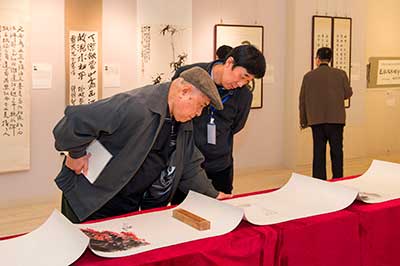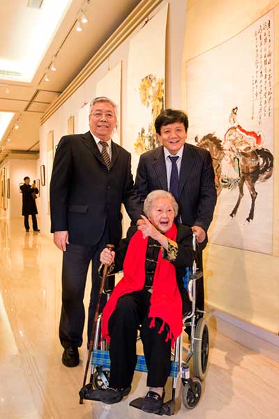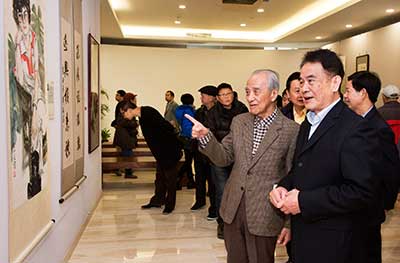 活动总策划、组委会执行主任邓培星、秘书长张金卫陪同李可染艺术基金会理事长邹佩珠先生观看展览