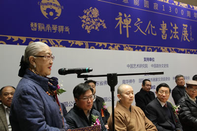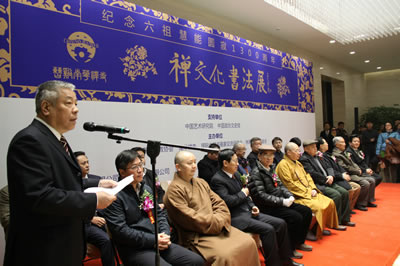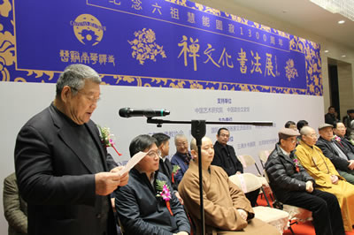 为纪念中国佛教界禅宗六祖惠能大师圆寂一千三百周年,弘扬历史悠久的佛教文化和书法艺术,由中国艺术研究院、中国政协文史馆、广东省佛教协会、南华禅寺、国际中国书画家交流促进会、林若熹艺术基金会等单位共同举办的“禅文化书法展”,于2013年12月24日在中国政协文史馆开幕。国家新闻出版总署原署长于友先,国家民委原副主任、国际中国书画有交流促进会副会长李晋有将军,海军原副政委康成元将军,国家宗教事务局副局长蒋坚永,中国文联原副主席罗扬,中国政协文史馆馆长赵珩,中华慈善总会荣誉副会长邓培星,中国华夏文化遗产基金会理事长耿莹,中国佛教协会常务理事、南华禅寺住持传正大和尚,著名书画家及社会各界知名人士邹德忠、林若熹、李正钢、容通法师、韦智仁、王清杰、原国镭、王连元、王裕国、张北云、甘霖等以及社会各界来宾六百余人出席开幕式。国际中国书画家交流促进会秘书长张金卫主持开幕式。在开幕式上,耿莹理事长、邹德忠会长、南华禅寺住持传正大和尚分别讲话,传正大和尚宣布展览开幕。开幕式后,南华禅寺住持传正大和尚代表南华禅寺向中国政协文史馆赠送了32篆体《坛经》及《禅文化书法展作品集》。