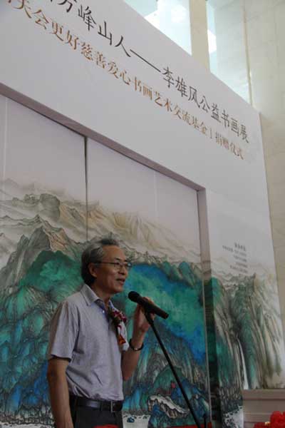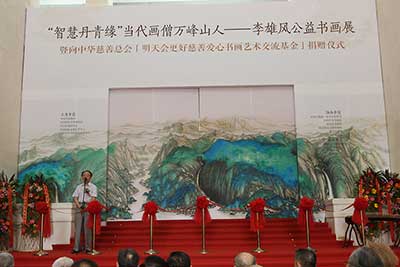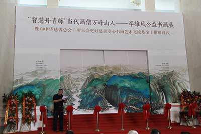 为弘扬文化,传播佛法,启迪智慧,播撒慈爱,展示当代画僧李雄风---万峰山人书画艺术成就,由中国书画报社、美国国际美术家协会、中国收藏家协会、中国国际文化艺术中心、国际中国书画家交流促进会联合主办的“智慧丹青缘——当代画僧李雄风---万峰山人慈善公益书画展开幕式暨向中华慈善总会明天会更好慈善爱心书画艺术交流基金捐赠作品仪式”,于2014年8月21日在北京民族文化宫隆重举行。全国政协教科文卫体委员会副主任、中国文联原书记胡振民,国家新闻出版署原署长、中国出版工作者协会主席于友先,国家民委原副主任、国际中国书画家交流促进会副会长李晋有将军,文化部原副部长常克仁,铁道部原副部长国林,中国文联原副主席罗扬,中央军委办公厅原副主任曹育民将军,中华清风书画协会常务主席傅新健,天津美术学院院长姜陆,中国佛教协会国际部主任普正法师,中国书画报社社长何东,国际中国书画家交流促进会副会长覃汉龙、郭廷真、李正钢,北京市云居寺方丈果坚法师,社会科学文献出版社设计总监孙元明,《中国民族》杂志社党委书记郭正英,中央国家机关书法家协会主席团成员、国艺美术馆馆长王清杰,中国文化产业研究院院长陈步一,国际中国书画家交流促进会副秘书长陈伟,中国政协文史馆展览部主任蔡傅强,香港特区和澳门特区区旗区徽设计者肖红,南京理工大学院长王无际,文化部艺术品评估委员会委员王敬之,中国汉唐画院院长程华,师白研究会会长娄述德,世界艺术收藏联合会主席华奎,中国教育网络电视台书画台副主编彭一超,中国楚简书法研究院院长李金泰,美国中华艺术学会顾问梁政均,中国台湾中华书法教育学会理事长简英智,香港美术研究会会长王子天,及著名书画家和社会各界知名人士曹心源、徐勤军、王功学、宋青松、陈志强、马继峰、崔国一、陈德泉、潘维辰、马万国、张肇达、成星、张扬、黄麟、大畅、冯柯、邢秀山、苗雪珊、邓少军等数百人出席。在开幕式上,何东社长、普正法师、王清杰馆长、孙元明总监先后讲话,李雄风先生致谢辞。国际中国书画家交流促进会张金卫秘书长主持开幕式,并宣读了全国政协常委、中国侨联副主席、致公党中央主席李卓彬发来的贺信。李雄风先生向中华慈善总会明天会更好慈善爱心书画艺术交流基金和兰州报恩寺捐赠了书画作品,以表达他对祖国慈善事业的支持,中华慈善总会筹募部副主任、明天会更好慈善爱心书画艺术交流基金管理办公室陈希副主任接受捐赠,中华慈善总会明天会更好基金顾问李晋有向李雄风先生颁发中华慈善总会捐赠荣誉证书。胡振民、于友先、李晋有、常克仁、国林、罗扬、普正法师、姜陆、王子天等领导和李雄风先生为展览开幕式剪彩。