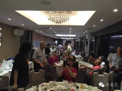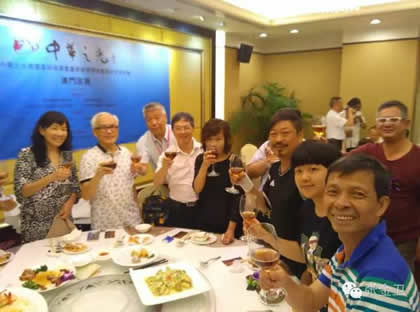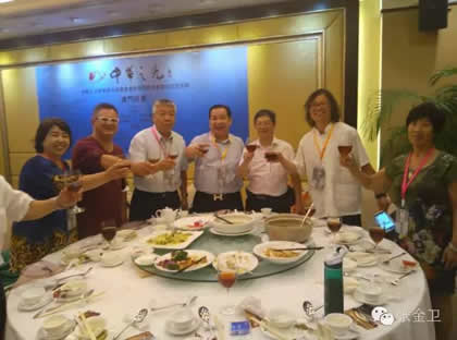 在庆祝宴会上,张金卫秘书长、郭洪球主席、李秋平会长与澳门书画家一起共祝活动圆满成功