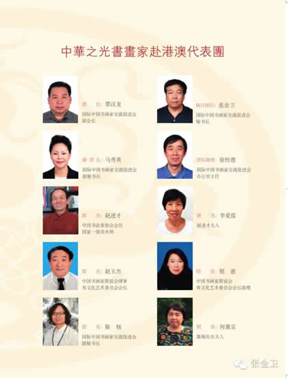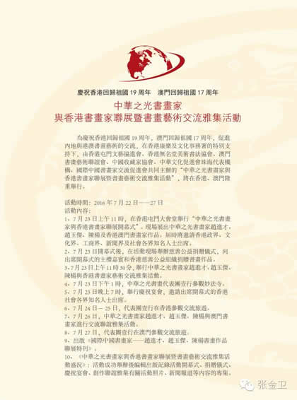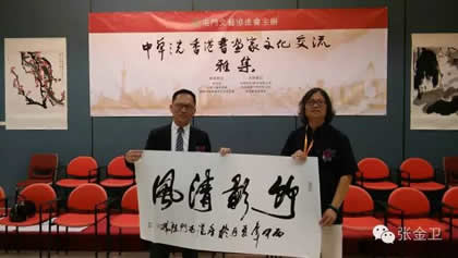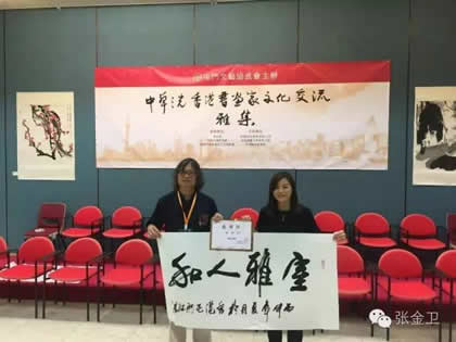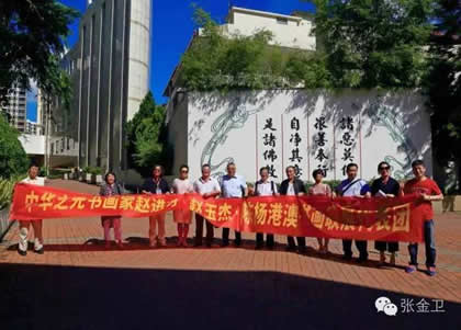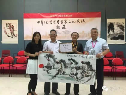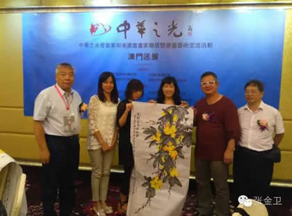 2016年7月23日——28日,由国际中国书画家交流促进会副会长覃汉龙任团长,国际中国书画家交流促进会秘书长张金卫任执行团长,国际中国书画家交流促进会副秘书长马秀英任副团长的中华之光书画家赴港澳代表团一行十人出席为庆祝香港回归祖国19周年,澳门回归祖国17周年,促进内地与港澳书画艺术的交流,在香港康乐及文化事务署的大力支持下,由香港屯门文艺协进会、香港无名堂美术书法协会、澳门书画艺术联谊会、中国收藏家协会、中华文化促进会珠海代表机构、国际中国书画家交流促进会共同主办,广西福森投资有限公司、宁夏观唐文化传媒有限公司、中国书画家联谊会寿文化艺术委员会、易达物流( 香港) 有限公司、新恊棚业工程有限公司、香港艺术论坛网协办,北京新时代经纬文化中心承办的“中华之光书画家与港澳书画家联展暨书画艺术交流雅集活动”。