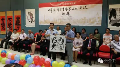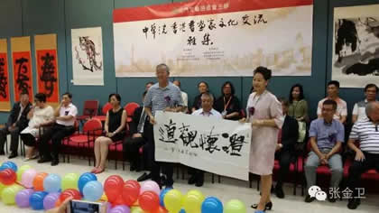 国际中国书画家交流促进会秘书长张金卫先生在开幕式上宣读了国际中国书画家交流促进会潘震宙会长、李晋有副会长、康成元副会长及中国书法家协会名誉主席沈鹏先生、中国文联荣誉委员、中国美术家协会顾问王琦等领导的贺电。张秘书长在讲话中对香港屯门文艺协进会和郭洪球主席对此次活动给予的大力支持表示衷心感谢。国际中国书画家交流促进会副秘书长马秀英女士代表此次活动代表团致辞。她在讲话中表示,本次活动为庆祝建党95周年,香港回归祖国19周年,澳门回归祖国17周年,邀请中华之光书画家赵进才、赵玉杰、陈杨三位书画家前往香港、澳门,与港澳书画家举办联展、书画雅集活动,以促进内地书画家与港澳的艺术文化交流为目的,并预祝活动取得圆满成功。