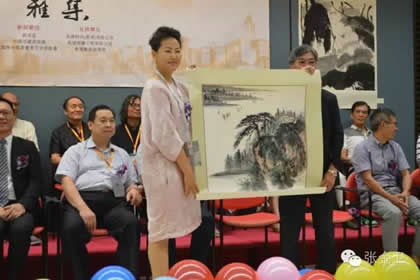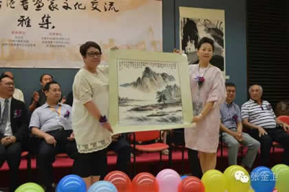 本次活动代表团副团长、国际中国书画家交流促进会副秘书长马秀英女士向出席活动主礼嘉宾香港屯门文艺协进会副主席李莹女士赠送此行代表团团员陈杨先生作品