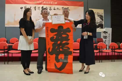 本次活动代表团团长、国际中国书画家交流促进会副会长覃汉龙先生向出席活动主礼嘉宾屯门区龙瑞卿议员赠送此行代表团团员赵进才先生书法作品