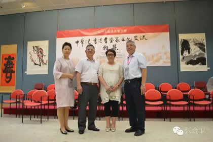 香港屯门文艺协进会副主席李莹女士、香港屯门文艺协进会视觉艺术委员会主席暨无名堂书法协会主席郭洪球先生、国际中国书画家交流促进会秘书长张金卫先生、国际中国书画家交流促进会秘书长马秀英女士合影留念