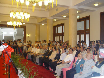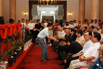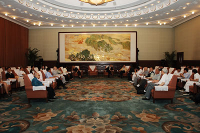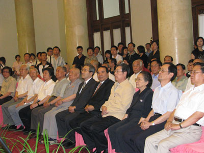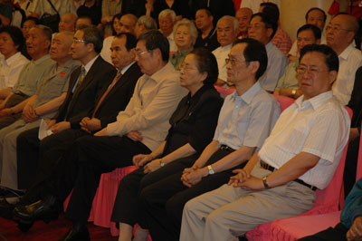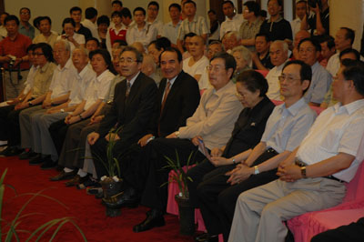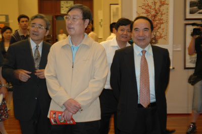 全国政协副主席黄孟复、阿不来提·阿不都热西提,十届全国人大常委会副委员长何鲁丽,中华慈善总会会长范宝俊在展览厅亲切接见主办单位负责人广东日生集团董事长邓培星,国际中国书画家交流促进会秘书长张金卫并合影留念。
