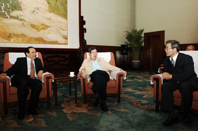 广东日生集团董事长邓培星陪同范宝俊会长观看抗震救灾图片展。