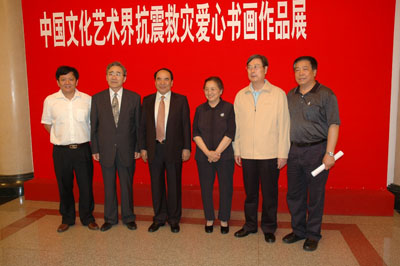全国政协副主席黄孟复、阿不来提·阿不都热西提参观中国文化艺术界抗震救灾爱心书画作品展。