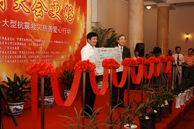 来宾在“重建校园 点燃希望”明天会更好大型抗震救灾慈善爱心行动活动开幕式签到处签到。
