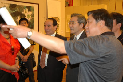 国际中国书画家交流促进会张金卫秘书长陪同全国政协副主席阿不来提·阿不都热西提,中华慈善总会范宝俊会长参观展览。