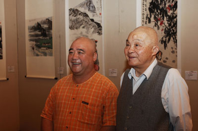 著名艺术家胡继高与著名曲艺表演艺术家李嘉存正在参观展览。