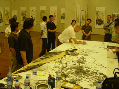 著名画家史国良先生正在创作丈二合作国画《踏春图》。