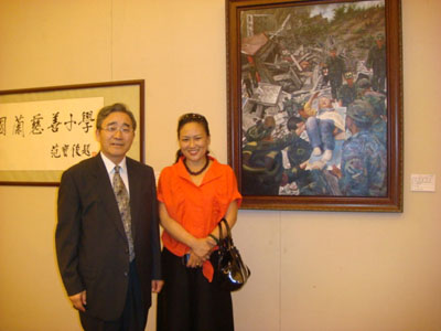 范宝俊会长观看《感恩》作品,并与作者那媛女士合影留念。