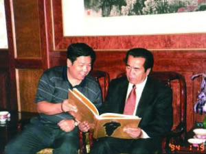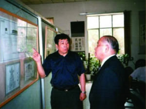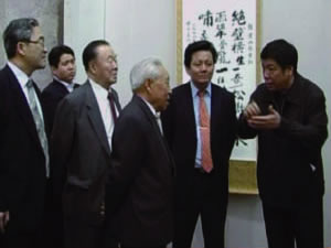 | 张金卫执行理事长在向日本客人介绍中科城筹备情况。 | 全国政协副主席杨汝岱、万国权、中华慈善总会会长范宝俊在本中心名誉理事长邓培星、张金卫执行理事长陪同下参观中国文化界名人书画展。 |