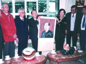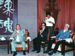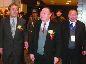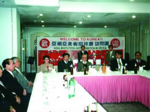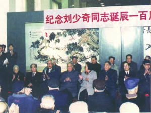 | 全国政协常委、中国书协常务副主席刘炳森,著名画家陈大章与张金卫执行理事长率国际中国书画家交流促进会代表团赴韩国访问。 | 张金卫执行理事长主持“纪念刘少奇同志诞辰一百周年书画艺术展”开幕式,党和国家领导人(左起)雷洁琼、王汉斌、罗豪才、陈锦华、彭佩云、布赫、蒋正华、孙孚凌、经叔平、王文元等出席。 |