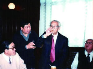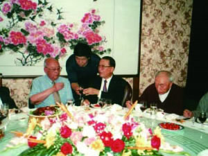 | 李正钢理事长陪同全国政协副主席万国权、中华慈善总会会长范宝俊观看展览。 | 张金卫执行理事长向程思远副委员长祝酒 (右为王光英副委员长,左为范宝俊部长)。 |