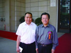 | 在《伟大丰碑全国书画大展作品集》首发式庆祝宴会上,张金卫执行理事长向出席活动的王光英副委员长、赵南起副主席、名誉理事长李晋有主任等领导敬酒。 | 李正钢理事长陪同中国文联副主席、中国美协副主席冯远参观展览后合影留念。 |