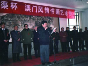 | 张金卫执行理事长出席在郑州博物馆举行的“伟大的爱国主义艺术家 中国画坛巨匠---徐悲鸿郑州画展”。 | 张金卫执行理事长在“锦绣澳门风情书画艺术展河南巡展”开幕式上致辞。 |